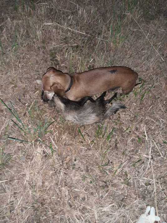 Ein besonderes Bild habe ich vom Herrchen von Colombo *Quito-Colombo vd Wirsitzer Eichen* bekommen. Es zeigt den jagdlich geführten roten Teckel am Marderhund. Colombo stammt aus der Verbindung meiner Dorothea vom Rehsprung und Engels Jago, beides passionierte Jagdhunde. Ganz herzlichen Dank!