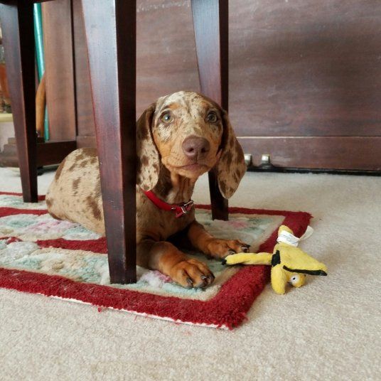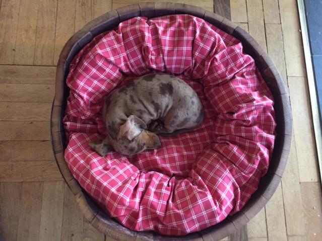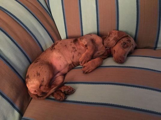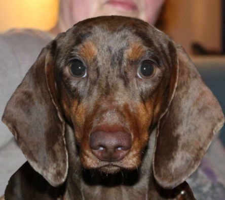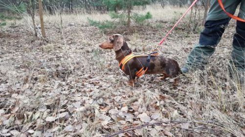 "Augusta wächst und gedeiht und wird immer munterer! Wir haben sehr viel Freude an ihr! Sie geht auch schon kurze Strecken tapfer an der Leine, wird dann aber in Ihrer neuen Dackeljagdtasche auch noch viel getragen..."